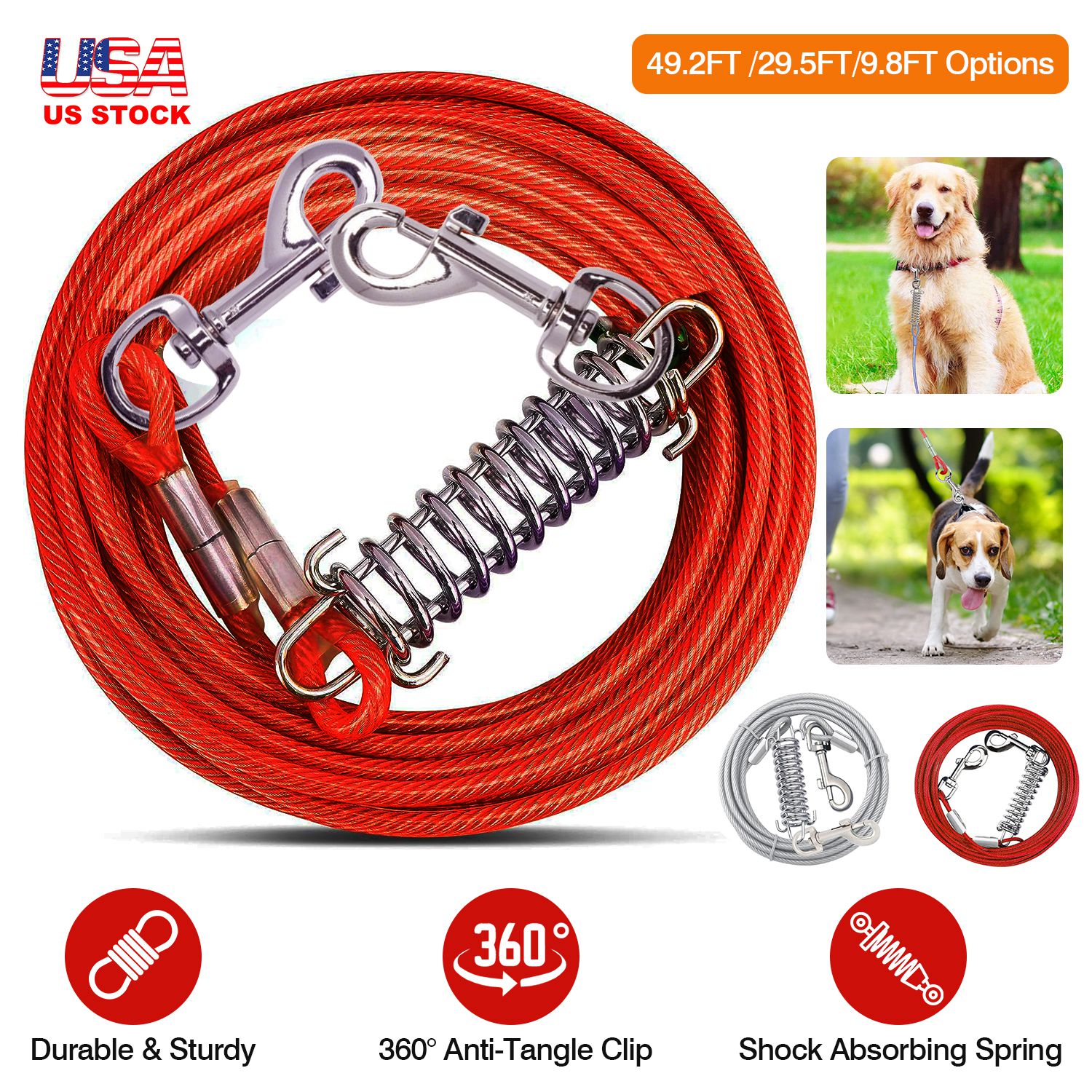 Home > 9.8FT Dog Tie Out Cable Long Dog Leash Chew Proof Lead Dog Chain with Durable Spring 360° Rotatable Clips PVC Case for Outside Yard Caming